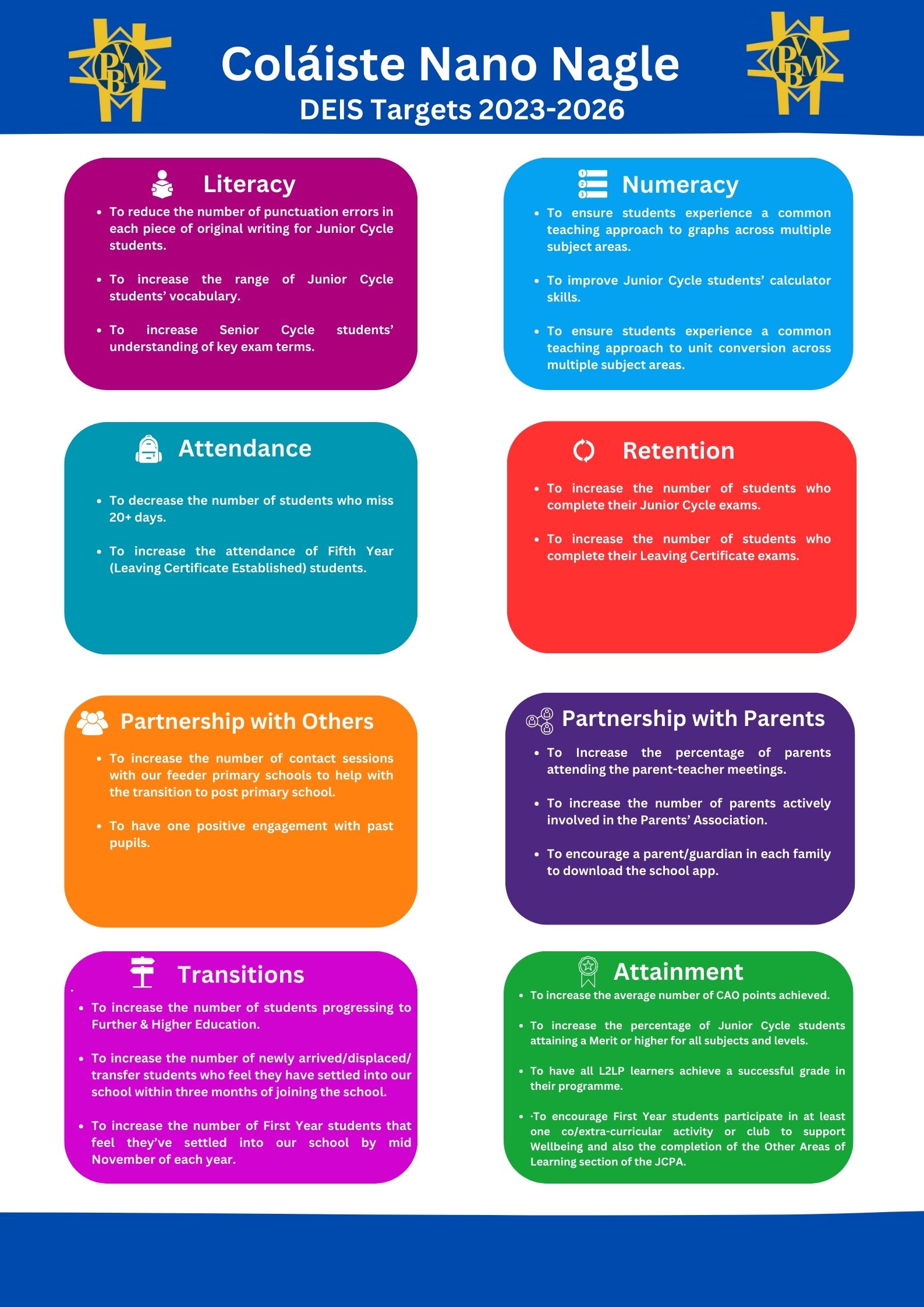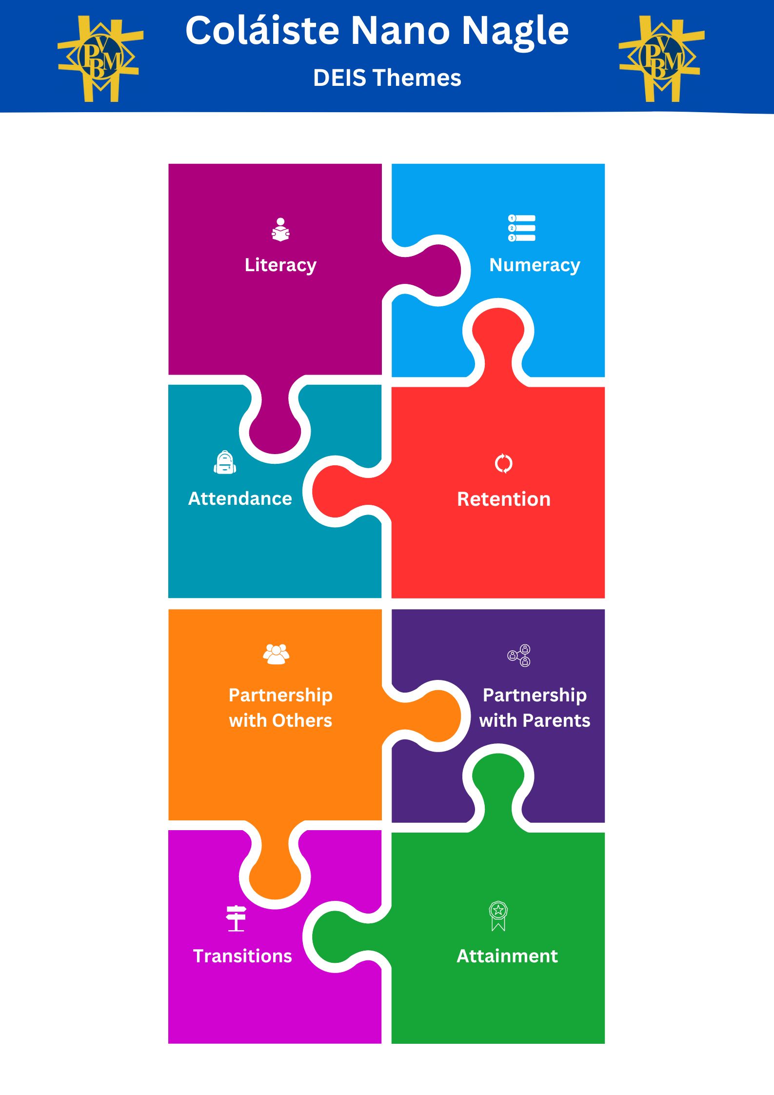 Schools in the DEIS programme are required to set out a three-year DEIS Action Plan for Improvement. As part of this process, schools are asked to set specific, measurable, achievable, realistic and time specific targets and to evaluate these annually by monitoring the impact of actions undertaken in the key DEIS themes. These are subdivided into 8 categories, known as DEIS Themes.