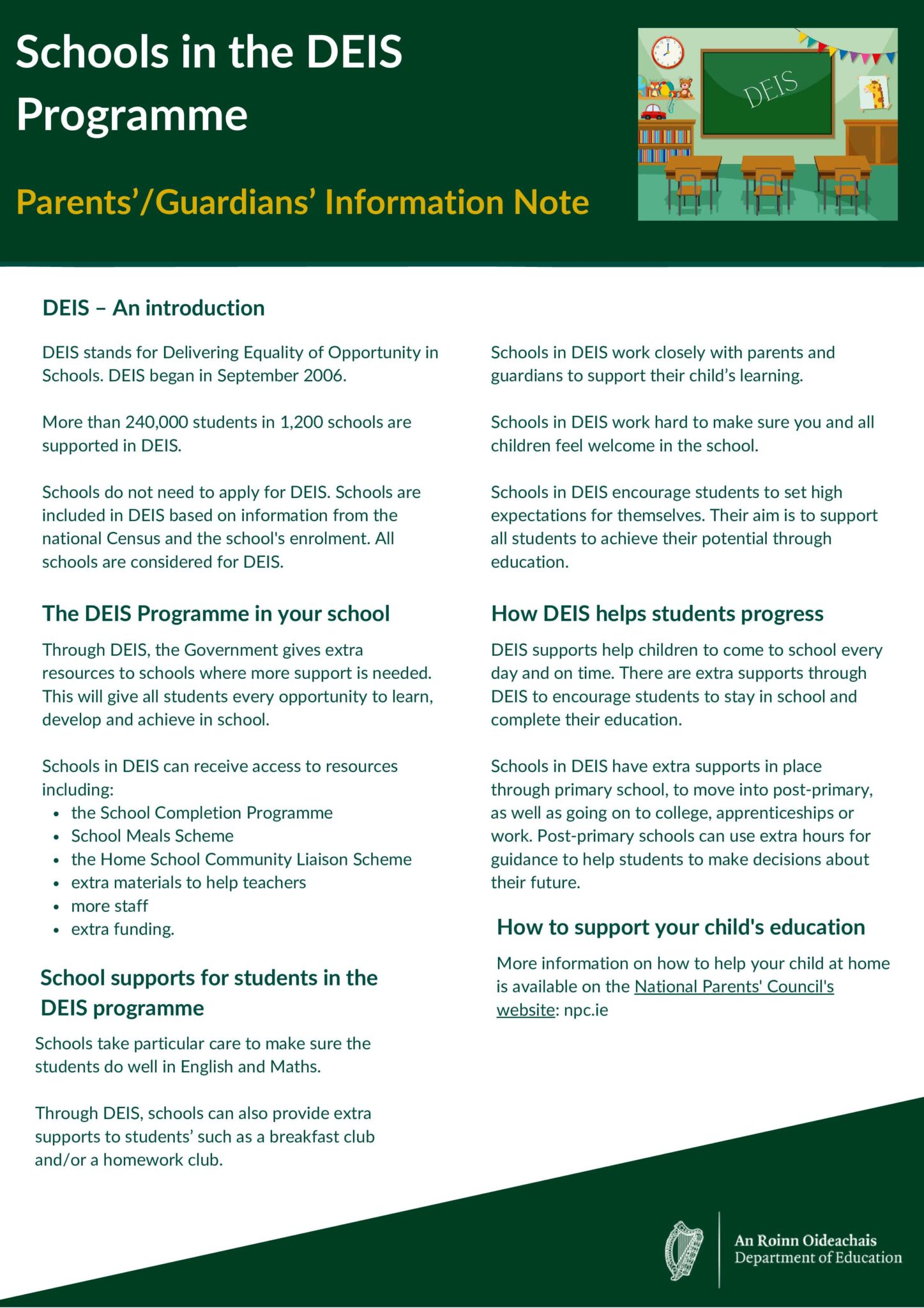 Launched in 2005 by the Department of Education and Skills, DEIS (Delivering Equality of Opportunity in Schools) is the most recent national programme aimed at addressing the educational needs of children and young people where it is needed most. A very significant element of DEIS is known as the School Support Programme (SSP) which is in place in about 340 urban primary schools, 340 rural primary schools, and 200 post-primary schools with the greatest need for extra support structures addressing many facets of school life (see www.education.ie ).