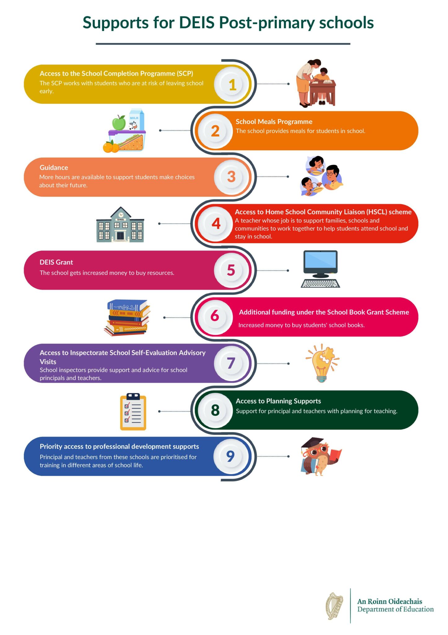 All primary and post-primary schools participating in DEIS receive a range of additional resources including additional staffing, funding, access to literacy and numeracy programmes, and assistance with activities such as school planning. As part of the SSP, interventions such as the Home School Community Liaison Scheme and the School Completion Programme are available to DEIS post-primary schools.